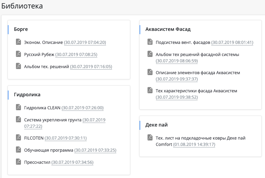 Часто дилерам необходима информационная поддержка по продукции компании. Это могут быть методические пособия, различные информационные материалы, материалы рекламного характера. Для того, чтобы дилер мог быстро найти информацию по интересующей его продукции в систему “Дилер 365” добавлен раздел “Библиотека”. В этом разделе представлены информационные материалы по продукции, поделенные на категории. Каждый материал может быть представлен файлом для скачивания или ссылкой в облачном сервисе. Менеджер может расположить большой объем данных на облачном сервисе, получить публичную ссылку для скачивания на этот информационный материал, а затем добавить элемент в библиотеку в определенную категорию. Такая модель хранения данных позволяет систематизировать библиотеку, и при этом на хостинге системы “Дилер 365” не увеличивается место, занимаемое самой системой на сервере.