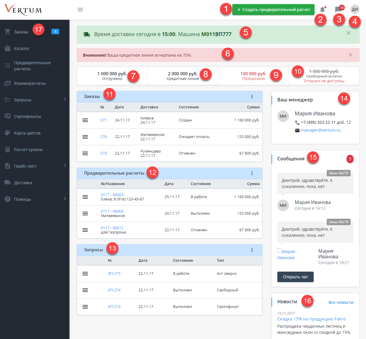 - Меню 17 представляет собой ссылки для навигации по разделам личного кабинета, состоящее из пунктов: