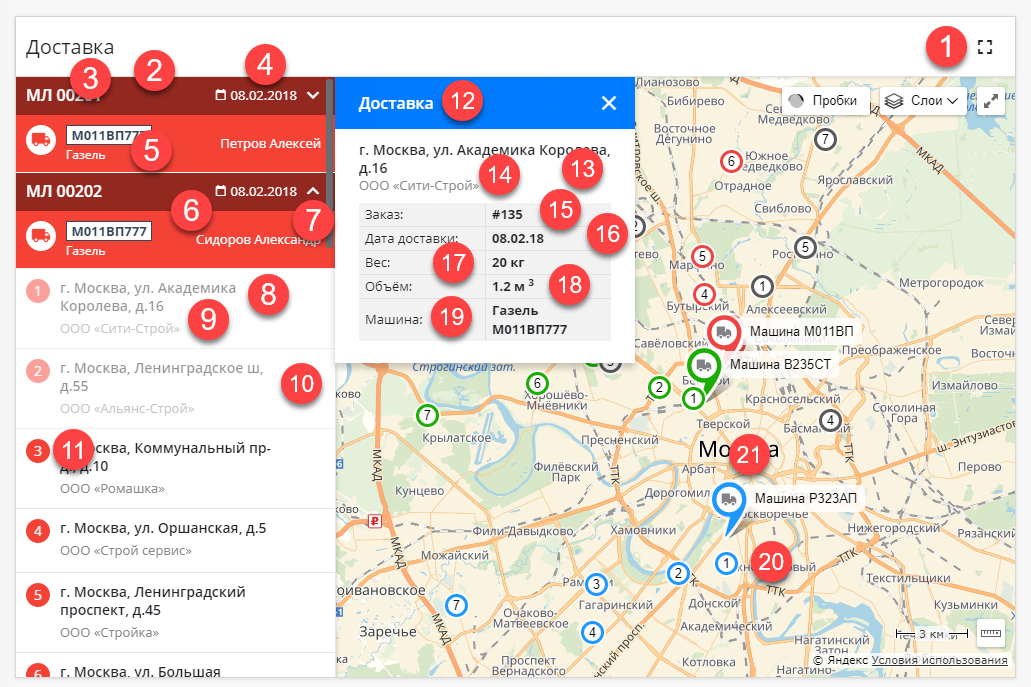 Список маршрутных листов 2. Маршрутные листы представляют собой задание с одной или несколькими доставками на определённую дату для водителя и определённую машину. Каждый маршрутный лист характеризуется номером 3, датой доставки 4, номером и моделью машины 5. Водитель имеет возможность раскрыть любой маршрутный лист, кликнув по его заголовку 6 либо по иконке открытия/закрытия маршрутного листа 7. В открывшемся маршрутном листе водитель видит под номерами доставки внутри каждого маршрутного листа. Эти же доставки с координатами и номерами меток показываются водителю на карте 20. Также водитель видит на карте метку своей машины 21, данные которой через GPS-трекер передаются на сервер личного кабинета. Каждая доставка представлена адресом доставки 8 и наименованием клиента 9. Клик по доставке позволяет водителю открыть всплывающее окно доставки 12. Те доставки, которые уже выполнены, отображаются в списке приглушенным цветом 10, те доставки, которые ещё предстоит выполнить водителю, показывается контрастным цветом 11.