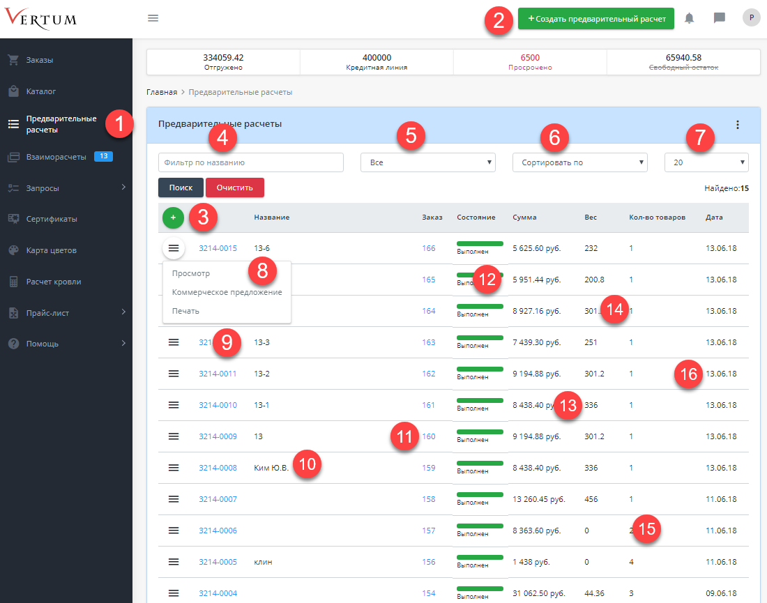 - Номер предварительного расчёта 9 служит ссылкой на редактирование предварительного расчёта;