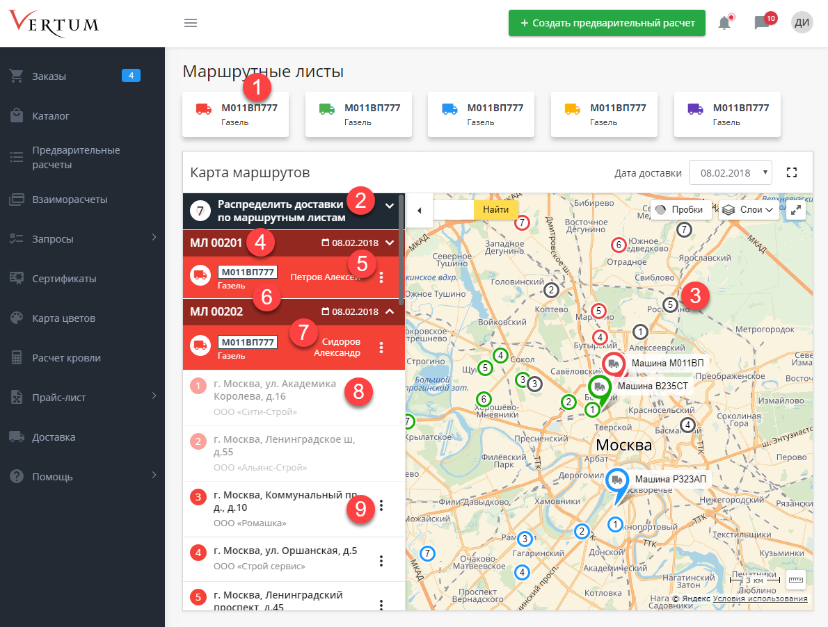 Машина в списке характеризуется цветом (этот же цвет используется для меток, отображающих очерёдность адресов доставки на карте и текущую метку машины). При клике по маршрутному листу открывается список