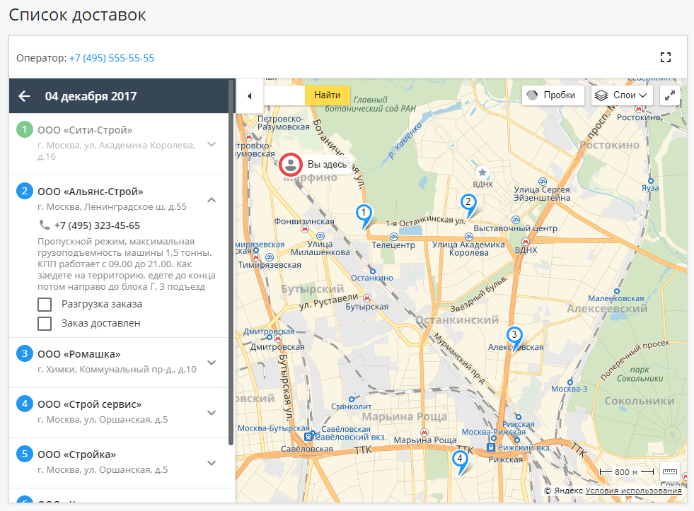 В интерфейсе водителя, при заходе в личный кабинет, водитель видит только свои маршрутные листы. При клике на маршрутный лист водитель видит список доставок в той очерёдности, которую ему задал старший экспедитор. Все доставки с метками в виде цифр очерёдности доставки водитель видит на карте. Таким образом, у него есть возможность визуально оценить, какие доставки куда он должен сегодня делать. При клике по доставке открывается дополнительная информация о доставке, в которой водитель может посмотреть особые условия по адресу доставки (смотри выше дополнительные адреса доставки, задаваемые дилером) Водитель может отметить флажком, что сейчас в настоящий момент он осуществляет именно эту доставку, таким образом старший экспедитор видит, какую доставку сейчас настоящий момент осуществляет водитель. По приезду в адрес доставки, водитель имеет возможность отметить у текущей доставки флажок "заказ разгружаются". По окончании разгрузки у водителя есть возможность отметить флажок "доставка осуществлена, заказ отгружен". В этом случае система отправляет состояние доставки в 1С компании, и менеджеры видят процесс доставок их заказов в режиме онлайн.