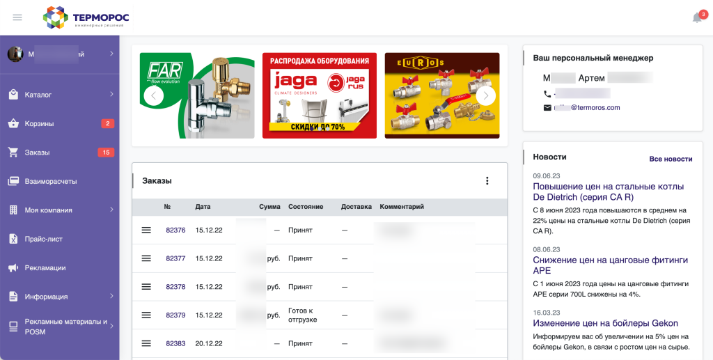 В августе 2022 года компания Терморос, которая занимается комплексными оптовыми продажами продукции для отопления, водо- и газоснабжения, обратилась к нам с задачей автоматизации оптовой торговли. Дилерами компании являются юридические лица, представленные одним или несколькими представителями. После анализа всех функциональных требований заказчика к проекту мы предложили реализовать проект на пакете "Все включено" системы Дилер365.