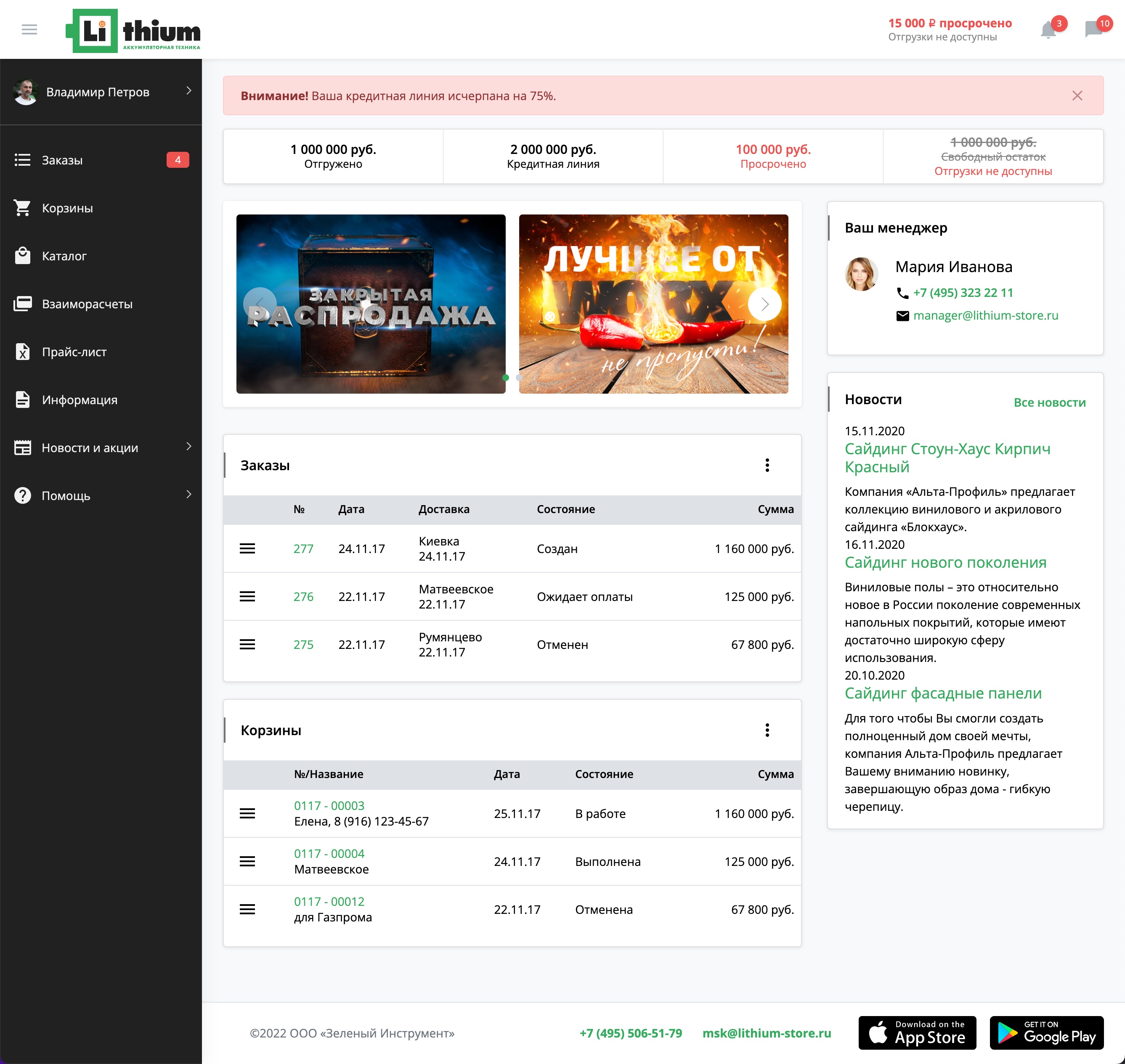 Дилеры могут заказывать товар как для пополнения остатков, так и выполняя определенный проект при формировании большого заказа для своего клиента. Именно поэтому дилеру необходимо иметь несколько одновременно действующих в системе корзин товаров, между которыми он может переключаться. В каждой корзине Дилер может ввести Имя, Телефон и Адрес электронной почты заказчика. Каждая корзина товаров после оформления отправляется в виде отдельного заказа клиента в 1С дистрибьютора.