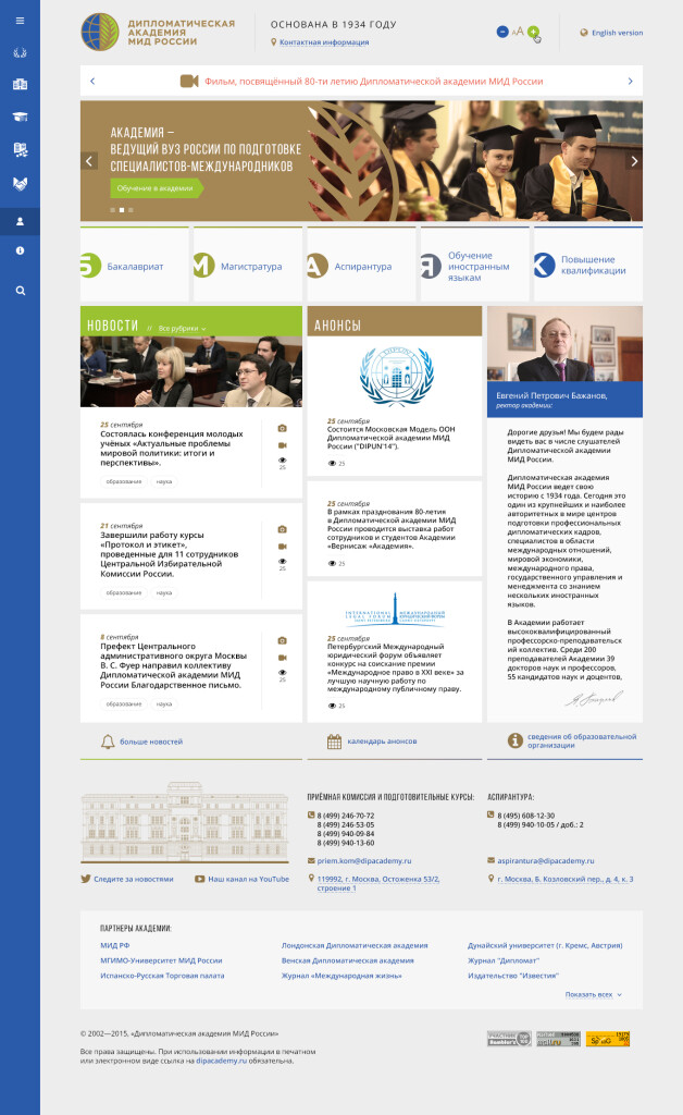Проект представляет собой адаптивный сайт высшего учебного заведения Дипломатической академии Министерства Российской Федерации. На сайте представлены разделы, освещающие жизнь ВУЗа, а также полезная информация для поступающих, обучающихся, партнёров и выпускников академии.