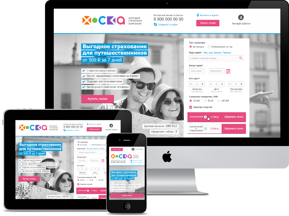 Перед началом работ нам были предоставлены алгоритмы вычисления цены страхового полиса для выезжающих за рубеж, в зависимости от страны и цели поездки, количества и возрастов выезжающих, а также индивидуальных опций, например, занятия спортом. Мы написали подробное техническое задание на создание сайта. Включая прототипы интерфейсов. В результате наш клиент не только на словах, но и визуально при подписании технического задания представлял работу сайта. Более того, мы в техническое задание включили и прототипы для разных ширин экранов.