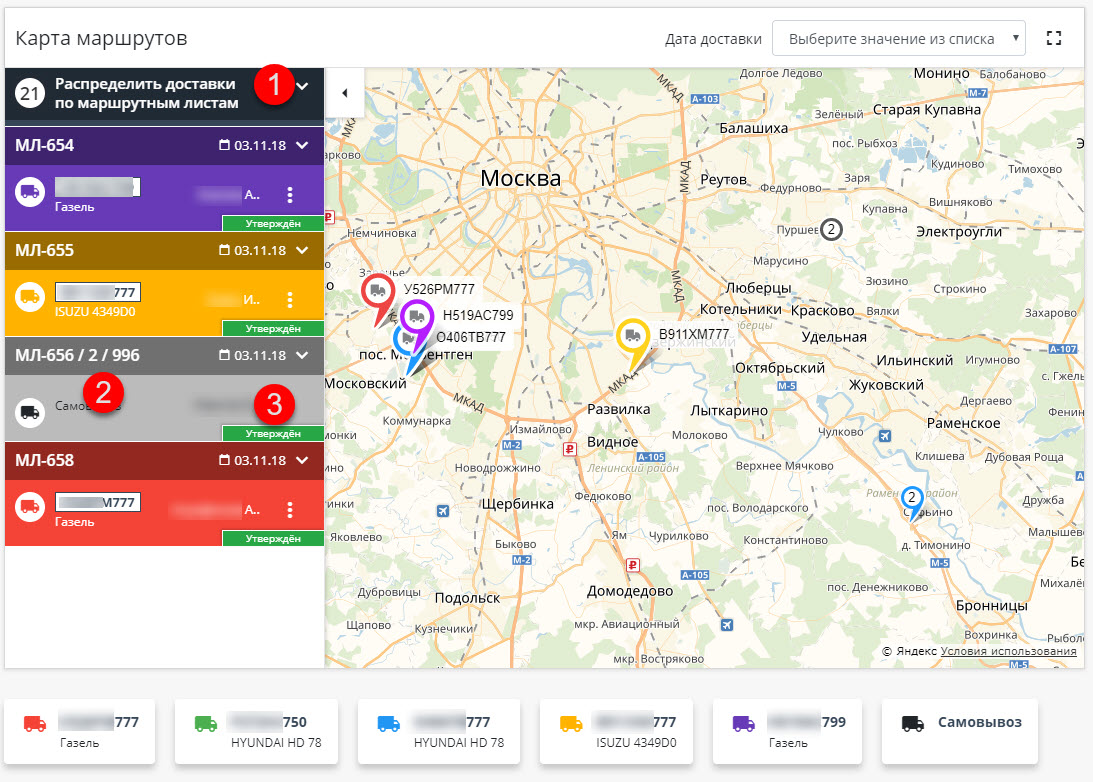 Аналогично нам пришлось изменить интерфейс маршрутных листов для показа менеджерам продаж. Менеджеры видят список не распределенных доставок 1, а также список сгруппированных по маршрутным листам доставок 2. У каждого маршрутного листа менеджер видит дату доставки, машину, водителя, а также статус маршрутного листа, список накладных внутри маршрутного листа. Это позволяет менеджеру в динамике смотреть, доставлен для его клиента заказ или нет. Либо менеджер сразу видит, в каком из маршрутных листов находится интересующая дилера доставка, то есть он может сообщить дату доставки заказа к дилеру. Также доставленные доставки имеют статус "доставлен" 3. Менеджер в течение рабочего дня видит не только статус у каждой доставки, но и предполагаемое расчетное время доставки каждого заказа каждому дилеру.