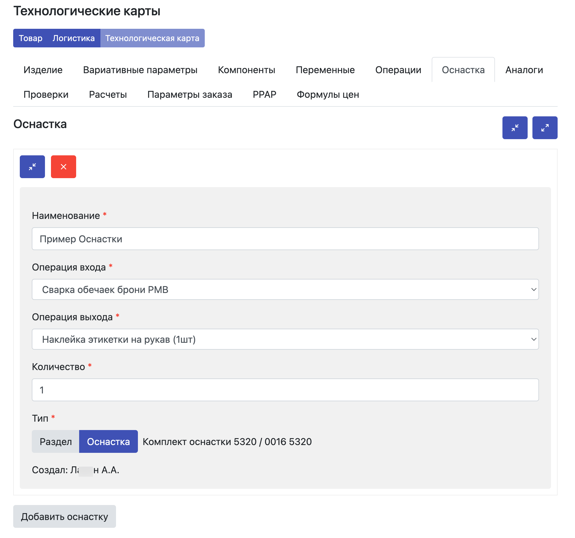 Подробнее процесс прикрепления оснастки к технологической карте изделия мастером описан в документации.