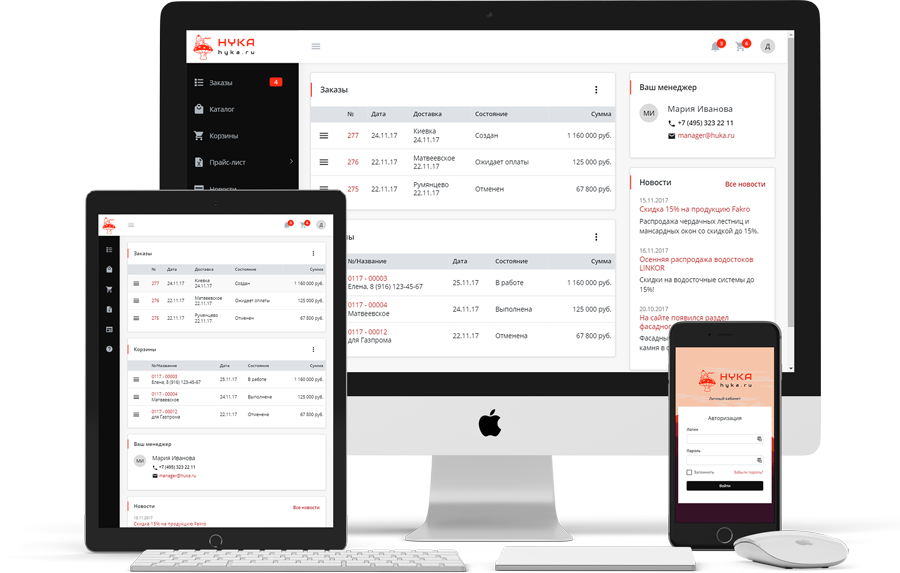 Так как клиенты компании расположены по всей России, система позволяет клиенту выполнять большинство задач по формированию заказа самостоятельно, без участия менеджера, несмотря на разницу часовых поясов. Информационное сопровождение дилеров реализовано на сайте личного кабинета с помощью новостей для дилеров, которые менеджеры добавляют через административную часть, и раздела «Информация», в котором сгруппированные по разделам файлы для скачивания предлагают дилерам информацию о торговых условиях, правилах оптовой торговли компании, рекламных и информационных материалах для предоставления конечным покупателям. Менеджер компании на сайте личного кабинета управляет полным списком клиентов, задавая для них в качестве логина номер сотового телефона (он  используется для СМС-информирования состояния заказов, а также авторизации клиентов в личном кабинете), адрес электронной почты, а также колонки оптовых цен, по которым работает дилер компании. Дилер при просмотре каталога товаров видит цены всех товаров по той колонке оптовых цен, которую для него установил менеджер. С более подробным описанием проекта предлагаем ознакомиться здесь.