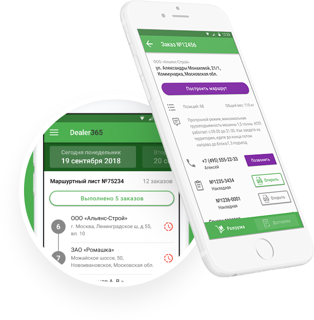Дилер компании в мобильном приложении работает с каталогом и заказами, ведет переписку онлайн, оформляет обращения. Водитель вашей компании или транспортного подрядчика отмечает в маршрутном листе выполнение доставок, система прогнозирует время следующей доставки.
