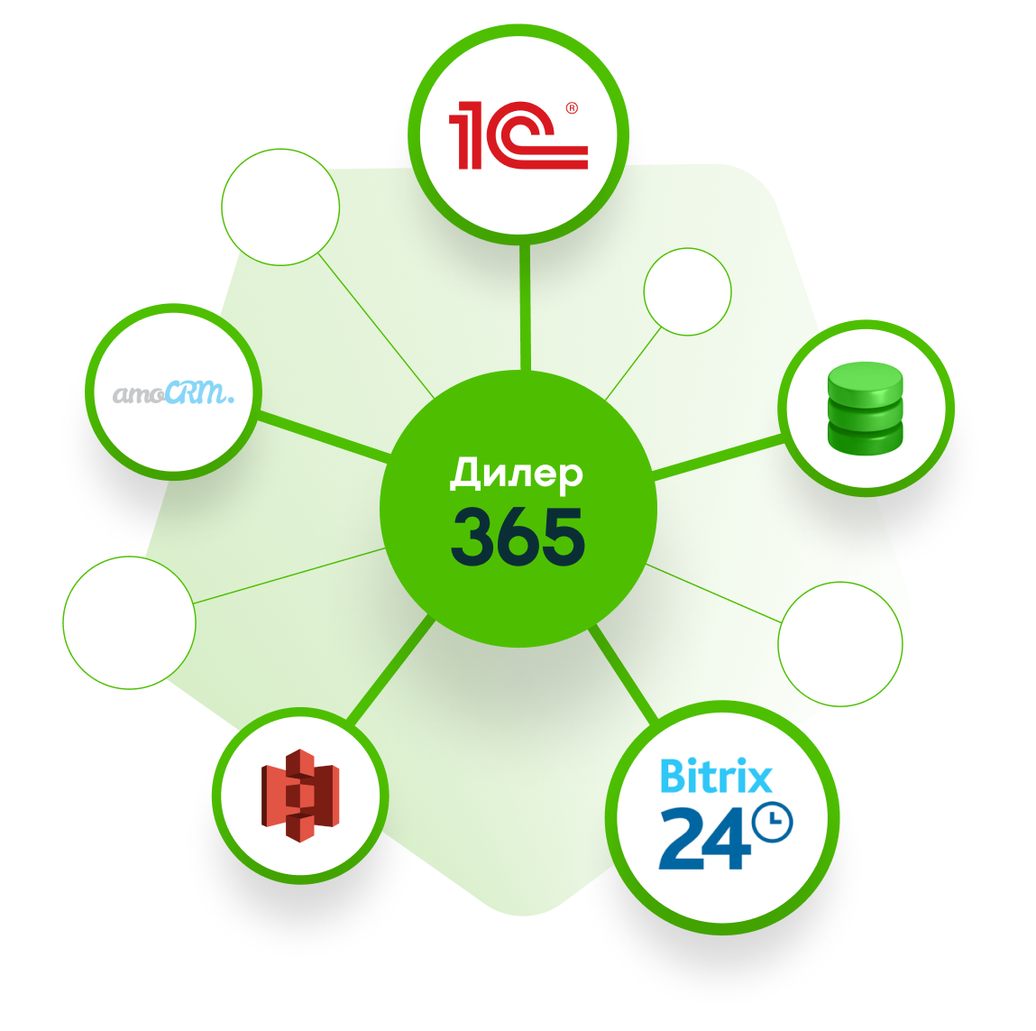 Дилер365 обменивается информацией с 1С, Битрикс24 и другими CRM, системами данных о товарах (PIM) и другими системами управления и учета по партнерам, контрагентам, договорам, торговым соглашениям, каталогу товаров с остатками и ценами дилера, заказам и учетным документам, дебиторской задолженности, акту сверки, доставке заказов, бонусам, рекламациям, план-факту и условиями продаж.