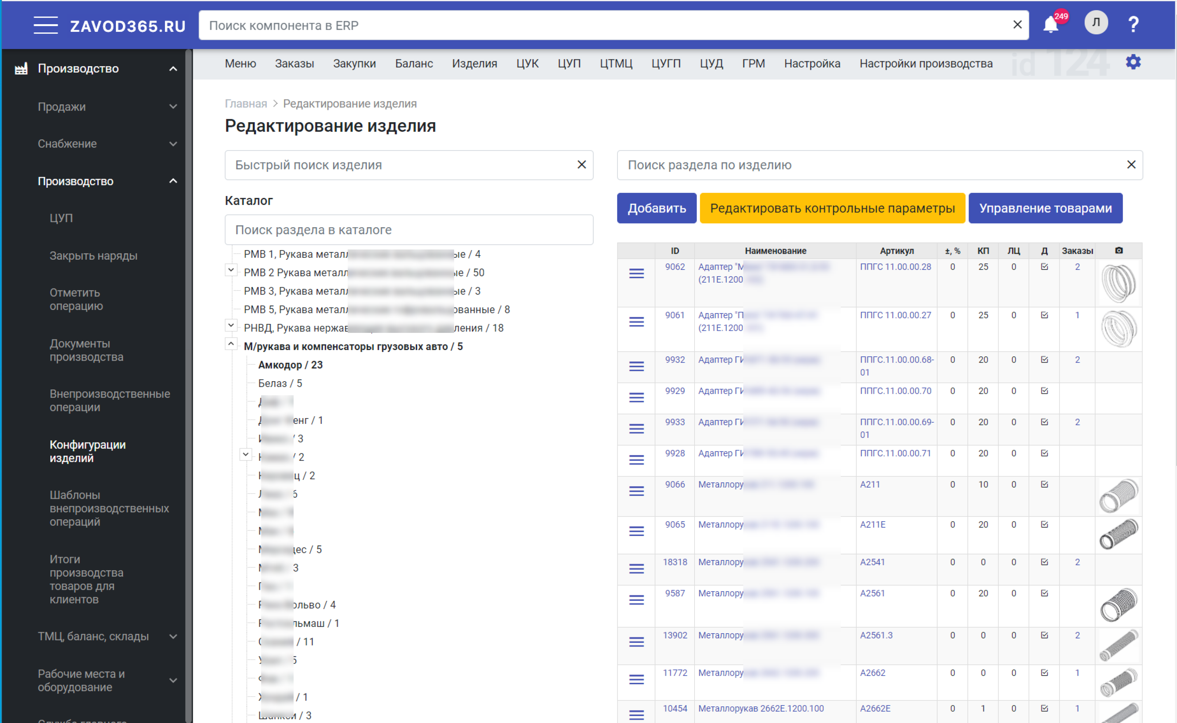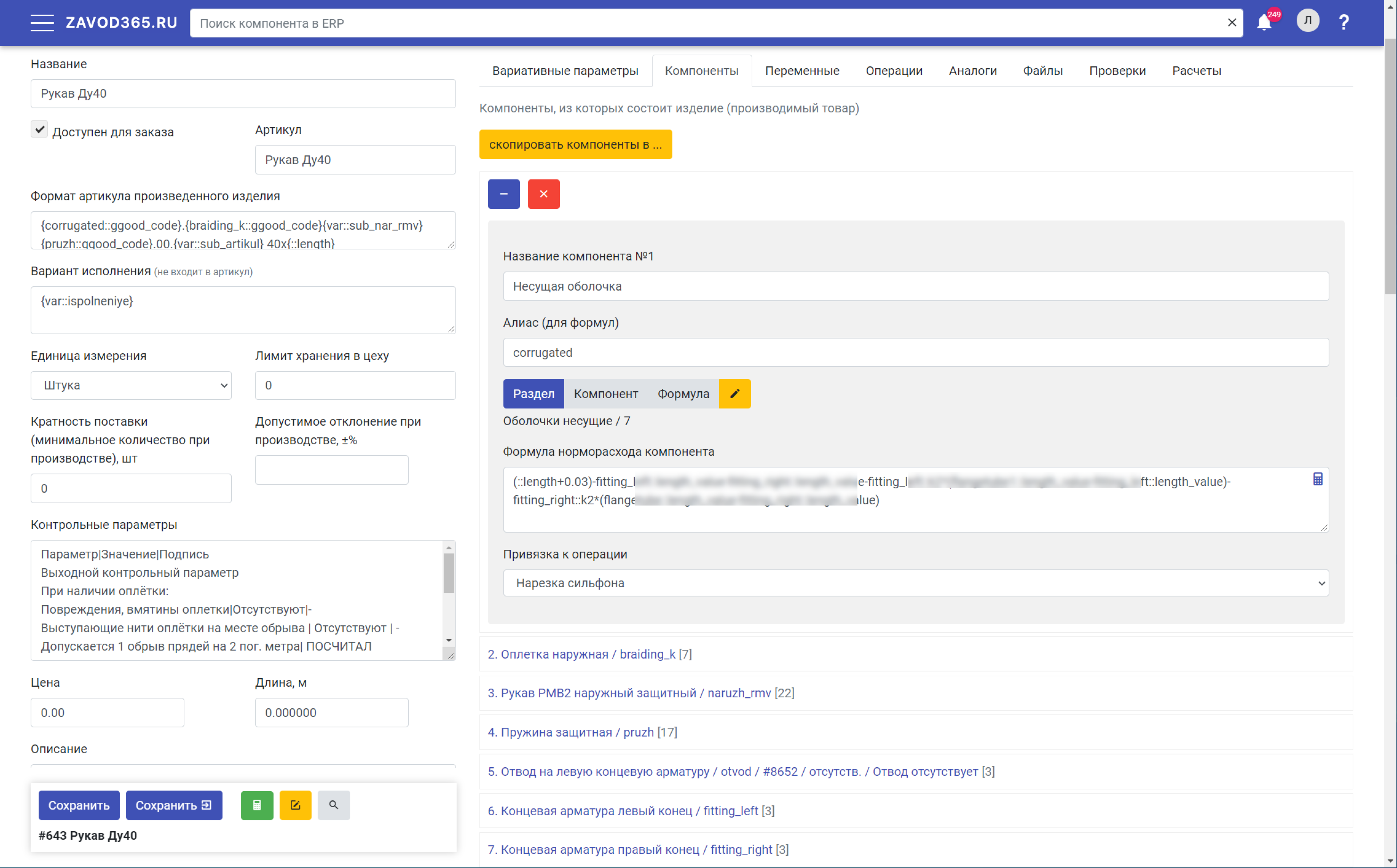 Конфигурации изделий, норморасходы комлектующих, время выполнения операций