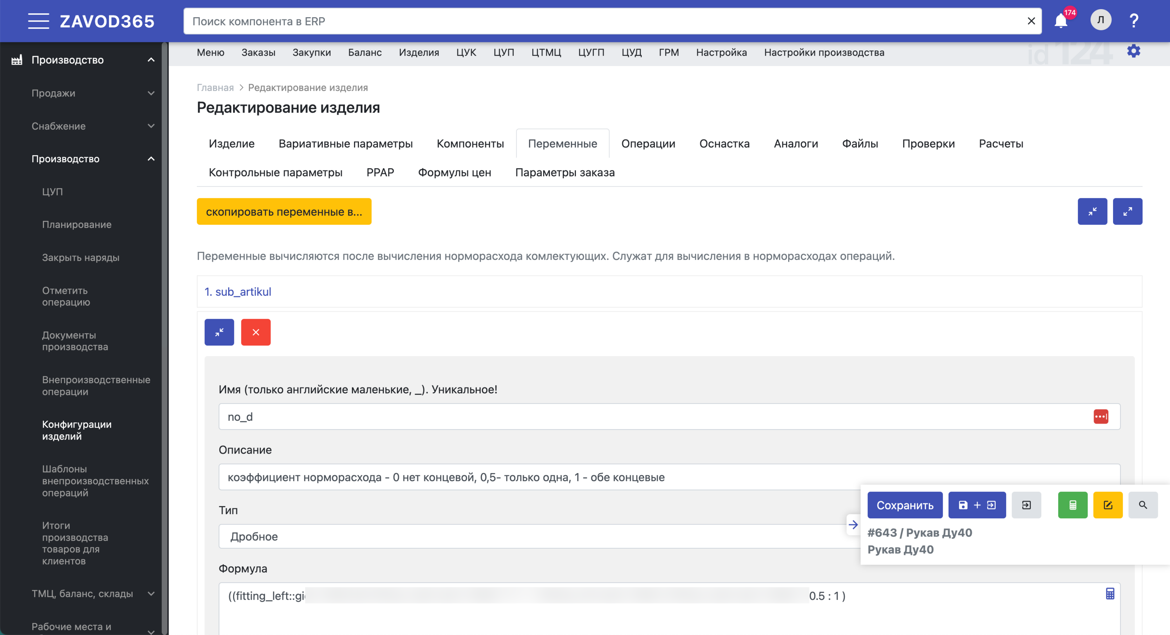В интерфейс расчета себестоимости изделия в системе Завод365 введены группы параметров для облегчения их ввода